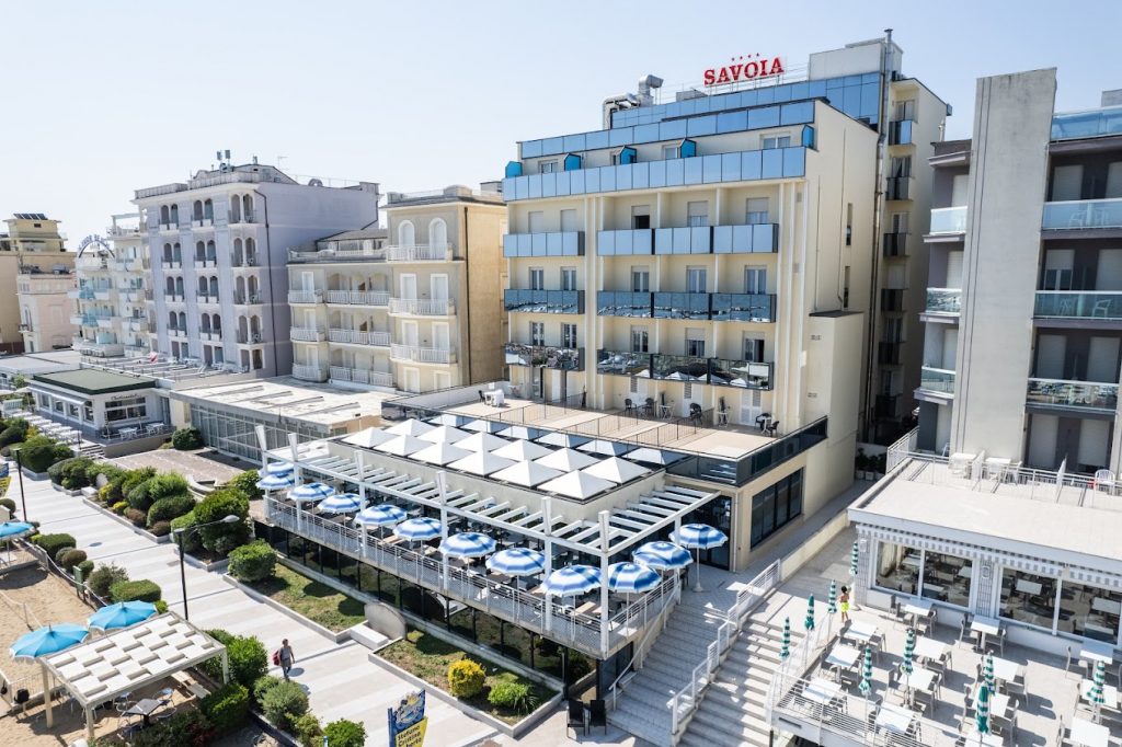L’hotel Savoia è un hotel a 4 stelle caratterizzato dalla struttura architettonica esclusiva basata su facciate continue di specchi e cristalli. Ha una tradizione di ospitalità, attenzione, professionalità e cortesia, caratteristiche che assicurano anche all’ospite più esigente un soggiorno piacevole e distensivo. L’hotel Savoia dispone di una ampia terrazza panoramica sulla spiaggia dove viene servita la prima colazione a buffet. Assieme alla suggestiva terrazza-giardino sulla romantica passeggiata del Viale Carducci fanno da cornice ideale alla dolce e rilassante atmosfera del mare.