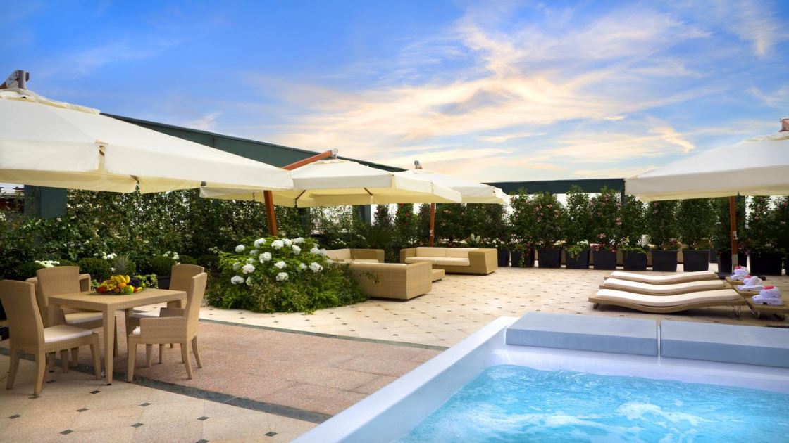 Una terrazza panoramica di 700m2 sui tetti di Milano: uno spazio architettonico capace di unire comfort, lusso e design, con una vista mozzafiato sui tetti della City fino alle guglie del Duomo. Situata all’ottavo piano dell’hotel, si affaccia su Piazza della Repubblica a Milano, nel cuore della citta ma lontana dai ritmi frenetici. Una chicca la zona solarium all’interno dell’area lounge, aperta non solo ai clienti dell’hotel. A farla da padrone grandi divani bianchi dove raccontarsi, bevendo uno dei numerosi cocktail in carta e spizzicando un aperitivo a buffet, immerso nel verde di un giardino ricreato ad hoc per spezzare la frenesia della metropoli.