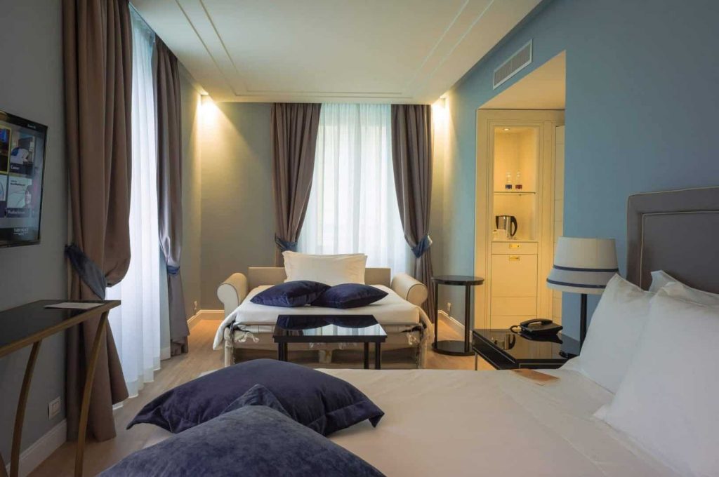 Il Turin Palace Hotel e lo storico albergo che sorge in via Sacchi, di fronte alla stazione di Porta Nuova: 12 mila metri quadrati e 127 camere per gli ospiti. I grandi spazi originari sono stati mantenuti cosi come anche l’ampio scalone aulico ma il tutto e stato reinterpretato in chiave contemporanea, con arredi lucidi e laccati e illuminazioni high tech.